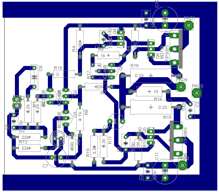 Näytä sivun lähdekoodiVanhat versiotPaluulinkitTakaisin ylös Yksinkertainen BJT:llä toteutettu AB-luokan vahvistin Tämä skema on napattu Rod Elliottin sivuilta, kyse on Project 3a:sta, sieltä löytyy tarkempaa tietoa kytkennän toiminnasta. Kytkennässä yksi pari ulostulotrankkuja riittää 8 ohmiin, mutta neljään ohmiin ajettaessa olisi ehkä hyvä laittaa kaksi paria. Tällöin on hyvä käyttää myös ajajina transistoreita joiden safe operating area riittää. BD139/140 sijaan voi käyttää esim MJE340/350 (parempi SOA isommilla jännitteillä vaikka virrankesto nimellisesti pienempi) tai MJE15034/35 (riittää varmasti). Ulostulotransistoreina voi käyttää melkolailla mitä tahansa järkevän SOA:n ja tehonkeston omaavia vekottimia, esim. telokin hyllystä löytyvät MJ15003/4 ovat varsin päteviä. Myös vanhempia transistoreja kuten 2N3055/MJ2955 voi hyvin käyttää mutta tällöin kannattaa suosiolla käyttää kahta paria. Kytkennälle on tehty piirilevyt joissa voi käyttää yhtä komplementaariparia, kahta komplementaariparia tai kahta NPN-transistoria ns. quasikomplementaarisessa konfiguraatiossa. Kahdelle kivelle tehtyjä levyjä voi käyttää myös yhdelle parille, sekä päinvastoin kunhan lisää emitterivastukset. Layout yhdelle komplementaariparille tarkoitetulle piirilevylle: Ja piirilevymaski: Lisäksi maskit ja leiskat komplementaariselle ja quasikomplementaariselle vahvistimelle joissa on paikat emitterivastuksille: komplementaarisen piirilevyn layout emitterivastuksilla NPN:iä käyttävän piirilevyn layout emitterivastuksilla NPN:iä käyttävän piirilevyn layout emitterivastuksilla projektit/wanhat/ab-luokan_bjt-vahvistin.txt Viimeksi muutettu: 2019/09/18 20:31(ulkoinen muokkaus) Kirjaudu sisään