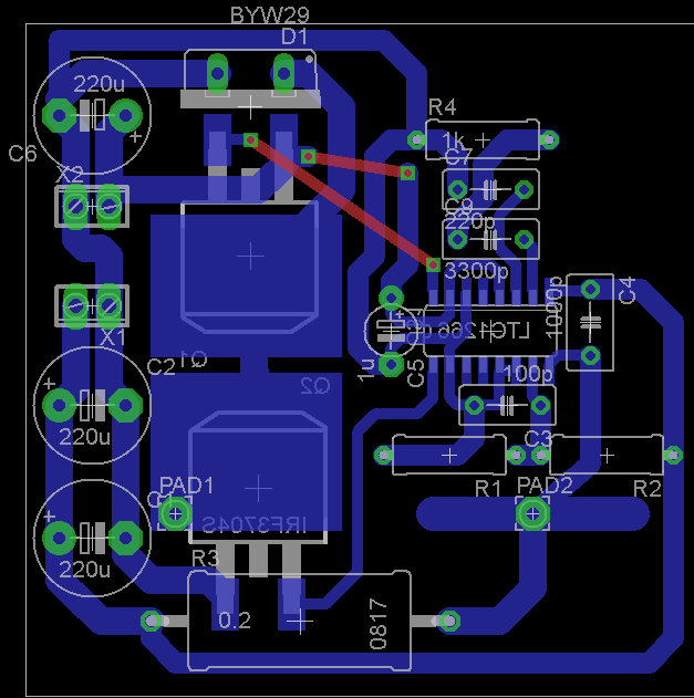 Näytä sivun lähdekoodiVanhat versiotPaluulinkitTakaisin ylös Step down -hakkuri LTC1266:lla Tämmönen perus hakkuri jossa käytetään Telokilla varastossa olevaa LTC1266 -hakkuripiiriä ja N- ja P-tyypin MOSFETtejä. Sopii alle 20V sisääntulojännitteille ja sitä pienemmille ulostulojännitteille ja telokilla olevalla MTD20P06HDLTH P-fetillä noin 3A kuormalle. Tarkemmat tiedot komponenttien mitoittamisesta eri kuormille ja jännitteille löytyy datasheetistä: http://www.datasheetcatalog.org/datasheet/lineartechnology/1266fa.pdf Maski Skema projektit/wanhat/ltc1266_hakkuri.txt Viimeksi muutettu: 2019/09/18 20:31(ulkoinen muokkaus) Kirjaudu sisään